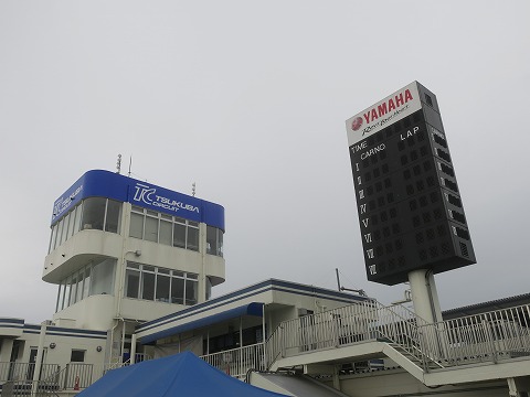 8:18 走行券を買いに 一通りの走行準備が出来たら走行券を買いにコントロールタワー脇に。 その前に定点観測。 空は一面の雲。 今日の走行はすでに始まっているので、売り場は空いてます。 |