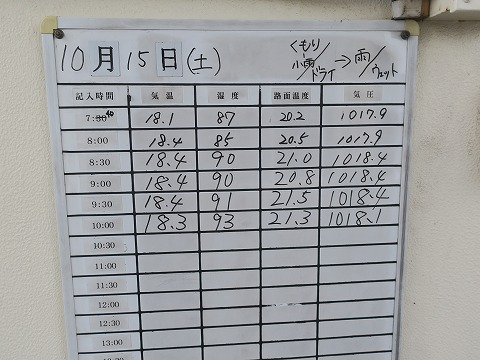10:21 走行2本目も 雨止みを待ちます。 そんな大した雨じゃないんですが、止まない。 止まないと、路面も乾かない。 2本目の走行10分前になりました。 雨止まないですね。 この時点で止まないと言うことは、走行までに路面も乾きません。 と言うことで、2本目の走行も走らないことにします。 今日は 78回目の走行になるハズでしたが、ハズレに終わりました。 (-_-;) |