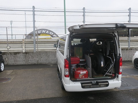 11:01 積込み完了 CBRと荷物の積み込み終わりました。 隣のスペースには、午後からの四輪の走行のクルマが駐まっていますね。 四輪はタイムは出ないけど、雨は雨でスライドコントロールの練習が出来て楽しそうです。 |