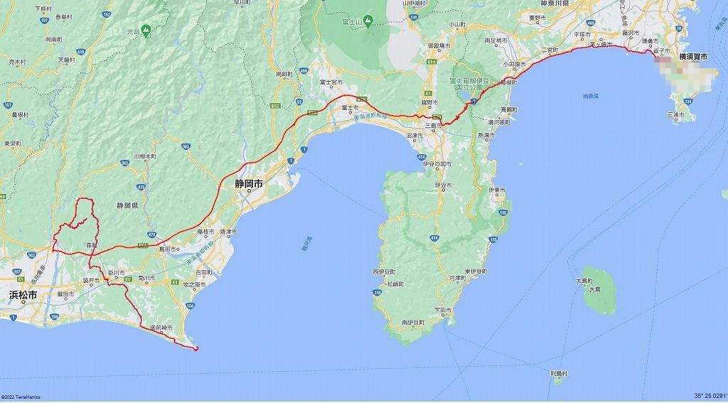 | 後半の道程:御前崎〜遠州森〜浜松市天竜区〜浜松浜北IC〜長泉沼津IC〜箱根〜小田原〜横須賀(自宅):327.69km | |