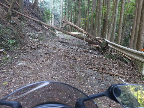 14:57 土砂が流出 「うわっ!」 と現れたのは、沢から道路に土砂が流れ出しています。 写真だと凹凸がわかりませんが、凹凸差は20cm近くあります。 乗用車だと完全に腹を擦る高さ、ジムニーなら大丈夫だろうけど。 GSX-Rだと「カウルの下側するかなぁ〜」 と言うレベル。 行くか、戻るか迷います。 けど、ここまで結構悪路を走ってきたのよね。 Uターンして戻るの面倒 くさ〜い。 行きます。 転けないように、両足をバタバタしながら、体重でサスが沈んで腹を擦らないよう中腰で・・・・。 何とか抜けましたよ。 (^_^)v |