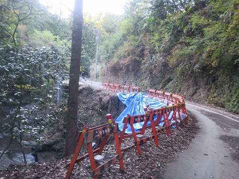 14:49 路肩決壊箇所 車両通行止の看板から少し進むと路肩が決壊している場所が現れました。 「ふむ。 確かに。 軽自動車なら通れそうですが、普通車だとギリギリだな。」 バイクなら問題なさそう。 ここが通行止めの箇所であれば、ここを過ぎれば県道を抜けられますね。 先に行っちゃいましょう。 |