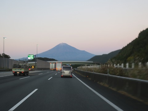16:56 新清水の先から 浜松浜北インターから新東名に上がり東進します。 新清水ICを過ぎた辺りから、正面に富士山が見えてきました。 頂には少しだけ雪を被っています。 空は少し暗くなってきました。 先を急ぎます。 |