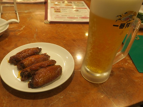 19:36 手羽先 バリそばを食べ終えましたが、少しもの足りません。 台湾ラーメンなら、追加でライスを頼んで食べてもいいけど、バリ焼きそばをおかずにゴハンって言うのはね。 ちょっと無理があります。 (個人的な意見です) で、追加で頼んだのが、手羽先。 これは揚げたものじゃなくて、煮たもの。 カウンターからガラス越しに見える調理場の鍋にどっさり入ってるんですよね。 これが結構な勢いで注文されてジャンジャンお皿に盛られていくもんで。 見ていて美味しそう。 なわけで、追加で注文。 甘辛く煮込まれた手羽先うまし。 これもビールに合いますよ。 |
