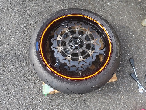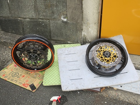 9:41 ブレーキディスクを陳列 両方のホイールからディスク版を取り外しました。 ディスクプレートを並べる。(笑) リボンが貼ってない方のホイールは後でタイヤを入れましょう。 とりあえず、次回走行用のリボン付きのホイールが優先で作業します。 |