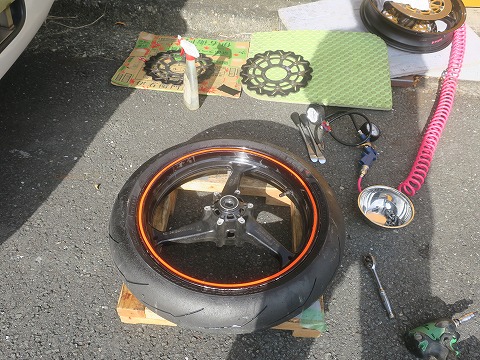 9:23 タイヤを外す ので、左側の昨日走行したタイヤを外して、右のリボン付きのホイールに履き替えます。 で、まずは両方のホイールからタイヤを外しました。 |