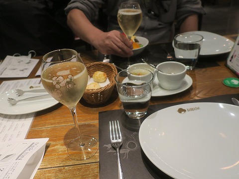 18:09 ウェルカム ドリンクで それでは、再開を祝して乾杯。 ウェルカムドリンクは発泡ワイン。 すっきりして美味しい。 今回はあらかじめコースを予約。 基本、全部食べ放題で、アルコールのみ、飲むことができる種類が決まっています。 |