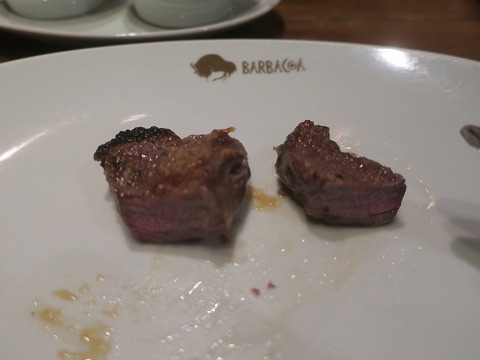 18:20 色々な 色々な部位をもったスタッフ、次から次へと回ってきます。 牛肉を中心にして、羊肉も、豚肉あり、種類はかなり多いです。 写真の奥は、骨が付いているので、リブ ロース? ですよね。 肉は岩塩を振って焼いたもので、シンプルな味わいです。 |