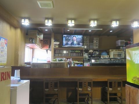 11:38 店内は 店内に入ると、ノーゲ(ノーゲスト)。 お客さんも居ないので、店内の写真を撮らせていただきます。 昭和チックですねぇ~。 まったりして長居しそうです。(笑) 店内は左手がカウンターで、右手がテーブル席。 水槽や生け簀があります。 |