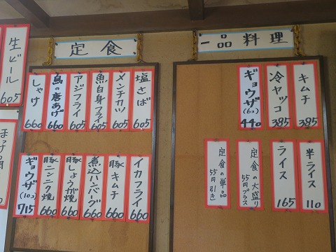 11:47 お品書きは さて、何を食べましょうかね。 壁に貼ってあるお品書きを見ます。 「やすっ!」 定食は、605円と660円の2択。 自分は、夜宿の食事は魚メインになるので、昼は肉で”豚ニンニク焼定食”。 MAOHさんは、アジフライ定食を所望。(アジフライ定食が人気みたいです) |