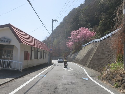 12:36 河津桜を 県道109号線で南下を続けていると、道路脇に植えられた桜が開花しているのが所々見られます。 ソメイヨシノが開花する前のこの時期なので、、ピンク色が濃い河津桜だと思いますが。 伊豆の河津町の地名がついた河津桜ですので、伊豆半島を走っているとところどころ目に飛び込んできます。 そんな河津桜を横目に、GROMを走らせます。 |