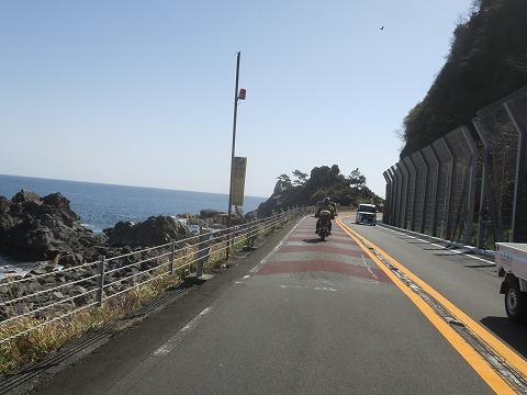 13:59 国道135号から 白浜からさらに国道135号線を南下すると国道135号線は西伊豆を走る国道136号線に変わります。 国道136号線に入ってさらに南下を続けると、石廊崎方面は国道から、直進して県道16号下田石廊松崎線に入ります。 前を走っていたバイクの集団は国道方面に右折していきました。 |