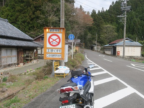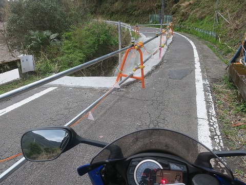 16:04 通行できます 通り抜けられない箇所までやってきました。 確かにこれじゃクルマ(四輪車)は通れないや。 でも、バイクは通れるね。 ちゃんとこれ以上崩れないように補修もしてあるし。 ちょっと狭くて恐いけど、先に進みます。 |