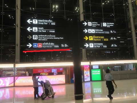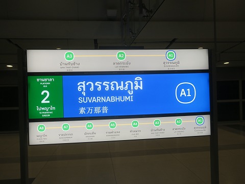 5:22 空港からは さて、今回は嫁さんのマンションにご厄介になる予定です。 朝が弱い嫁さんに早朝空港まで迎えに来てもらうのは可愛そうなので、自分一人で行くことにしました。 (不機嫌になる方が面倒です)(笑) 一人で空港から向かうのは初めてです。 一番簡単なのは空港からタクシー。 でも、それじゃ面白くないので、公共交通機関を使っていくことにします。 まずは、到着したバンコク近郊にあるスワンナプーム国際空港からエアポート レール リンク(電車)を使って、バンコクの市街地へ。 その後、BTS(スカイ トレイン)に乗り換えて最寄りの駅まで向かいます。 掲示板にエアポート レール リンクの表示を見っけ。 |