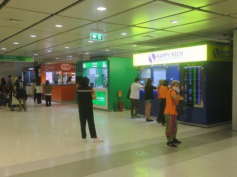 5:29 まずはタイバーツ エアポート レール リンクに乗るには乗車券を買わなきゃなりません。 乗車券を買うには、現地通貨のバーツ(タイバーツ)が必要。 持ち合わせが無いので、まずは両替。 出発前にネットで調べたら、エアポート レール リンク が出ている地下の、それも一番奥にある両替所が換金率が良いらしいとのこと。 で、(たぶん)一番奥にあると思われる両替所までやってきました。 両替所は3店舗並んでます。 これも事前情報だと一番奥にあるオレンジ色の”super rich”と言うお店が一番換金率が良いとの情報。 情報通り両替している人も一番並んでいますね。 |