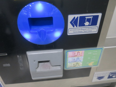 5:37 料金を 上の青色のところは card checkとか書いてあるけど、クレジットカードじゃないよね。 下手にカード入れて、出てこなくなっちゃったら面倒臭いので、無理はしない。 間違いのない現金で決済。(笑) 下のグレーのところに、紙幣を入れます。 両替した紙幣に青色の50バーツがあったので、50バーツを投入。 |