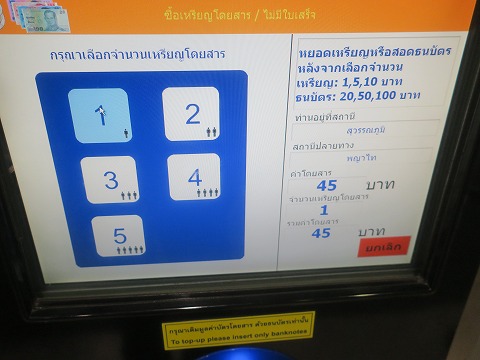 5:37 45バーツ 写真撮り忘れたので、後からもう一度画面だけ出してみたけど。 人数を押すと、45バーツって出てきます。 (英語を選択すれば、英語で表示されます) 45バーツなので、ざっくり45×4=180円 |