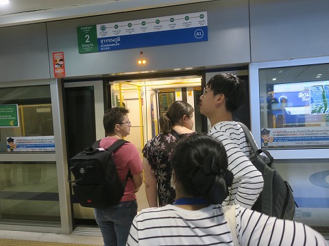 5:41 ホームに さっきのコインみたいなのを改札口でタッチして、ホームに入りました。 タイ語、全然読めません。 中国語も併記されているんですね。 それだけ、中国からも人が来ていると言うことでしょう。 とりあえずローマ字も併記されているので、どうにかなります。(笑) |
