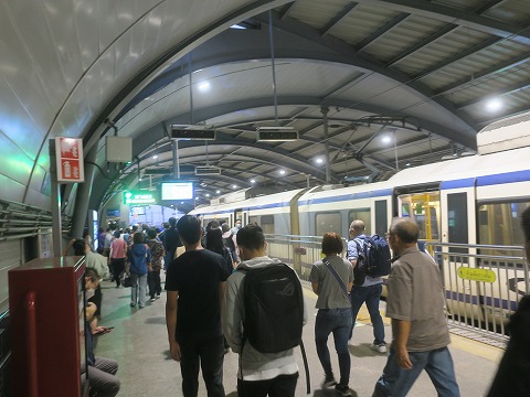 5:43 来た 電車がきました。 エアポート レール リンクはスワンナプーム(空港)初が朝5時台〜夜0時までみたいです。 昼間の多いときは10分に1本の割合で運行されているみたいなので、わかってしまえば便利ですね。 やってきた電車は始発かなと思いましたが、2本目だったみたいです。 では、乗ります。 |