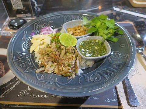 13:09 昼食は 出てきた料理は、嫁さんが頼んだのでなんて名前だか分からない。(笑) 「カオマンガイ=白米に茹でた鶏肉を載せたもの」のカニ肉版みたいやつでした。 手前のクリーム色の身がカニ肉。 で、味付けされたもの。 に、パクチーとかニンニクのスライス、レッドオニオン、ピーナツなどが添えられています。 それを混ぜて、右手前の緑色のソースをかけて、最後にタイ レモンを搾っていただきます。 サッパリした味で、美味しいです。(好みは分かれると思います) |