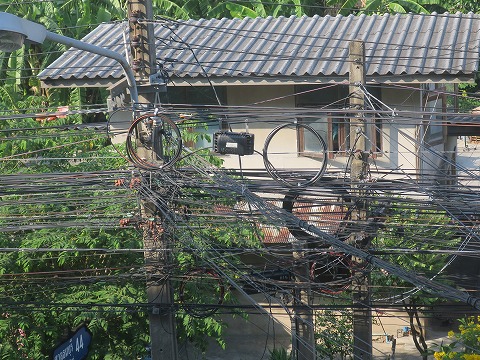16:05 収拾つかない電線 タイは電線が見事です。 この収拾が付かなくなったような電線群。 笑っちゃいます。 絶対全部は使ってないよね。 どれが使ってて、どれが使ってないか。 もはやわからないだろう。 バンコクの市街地のいたる所で見ることができます。 昨今、日本では「電柱が美観を損ねる。」と毛嫌いされていますが、これに比べたら日本の電柱なんてかわいいもんです(笑)。 |