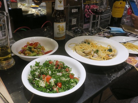 19:42 夕食です 仕事が終わって、ChitLomに戻ってきました。 夕食。 夕食も昼と同じ central ChitLom で。 頼んでまず出てきたのが、まずは手前から”トマトとイカとパセリのサラダ”、奥が”シーザーサラダ” それに、スパゲティのボンゴレ。 あと、自分はタイのビール”singha”。 嫁さんは赤ワインをボトルで。 後でシェアーしましたよ。 |