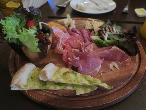 17:18 イタリアン レストランで レストランエリアに戻って。 適当に店に入ります。 お店はやっぱりイタリアン。 ハムとチーズの盛り合わせ、ピザ、サラダなどを頼みます。 今日の夕食はここで済ませます。 |