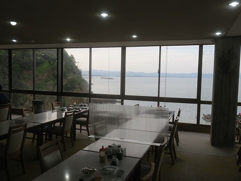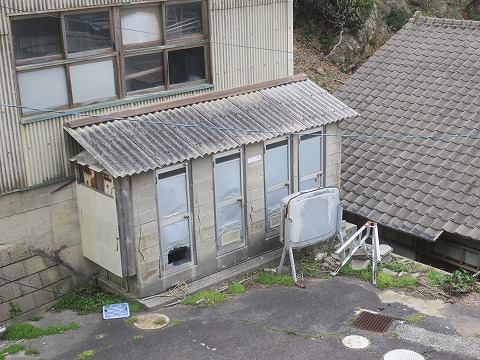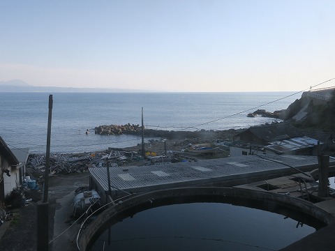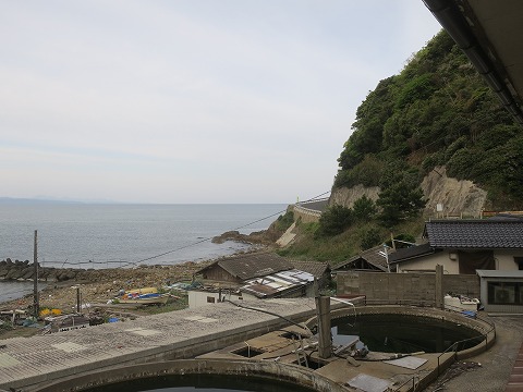 17:03 窓から 部屋からは海が見えます。 そして廃業したと思われる漁船や漁具の廃墟も。(笑) 手前の丸いプールは、生け簀?、養殖池?だったのかな。 宿は3階建てで、道路が高いところを走っているので、それに合わせて入口とロビー、食事処は3階。 自分が泊まっている部屋は一つ下の2階でした。 |