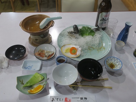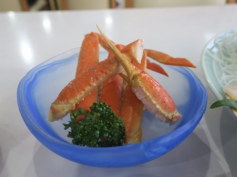 18:30 夕食の時間です。 夕食は6時半から食堂で。 席に着くと、すぐ運ばれてくるお刺身の盛り合わせとカニ。 |