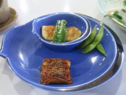 18:49 焼き物 料理がずんずん出てきます。 焼き物で、スズキのバター焼きと、手前がウナギの蒲焼き。 久しぶりに食べたウナギは、やっぱり美味しい。 |