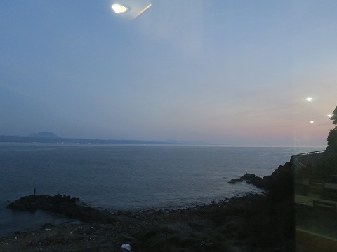 19:13 日の入り時刻 夕食を食べ続けていますが、ようやく辺りが暗くなってきました。 もう7時過ぎですもんね。 自分の住んでいる横須賀で日の入り時刻が7時を過ぎるのは夏至後の1週間くらいです。 西に来たのを体感しますね。 左端にポッコリ出ている山は、今日通ってきた三瓶山かな。 |