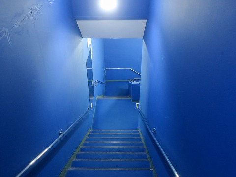 19:21 真っ青の 食事を終えて部屋に戻ります。 3階の食事処から2階の部屋に階段を下りていきます。 階段が真っ青なのよ。 真っ青。 なんか水族館みたいだね。(笑) |