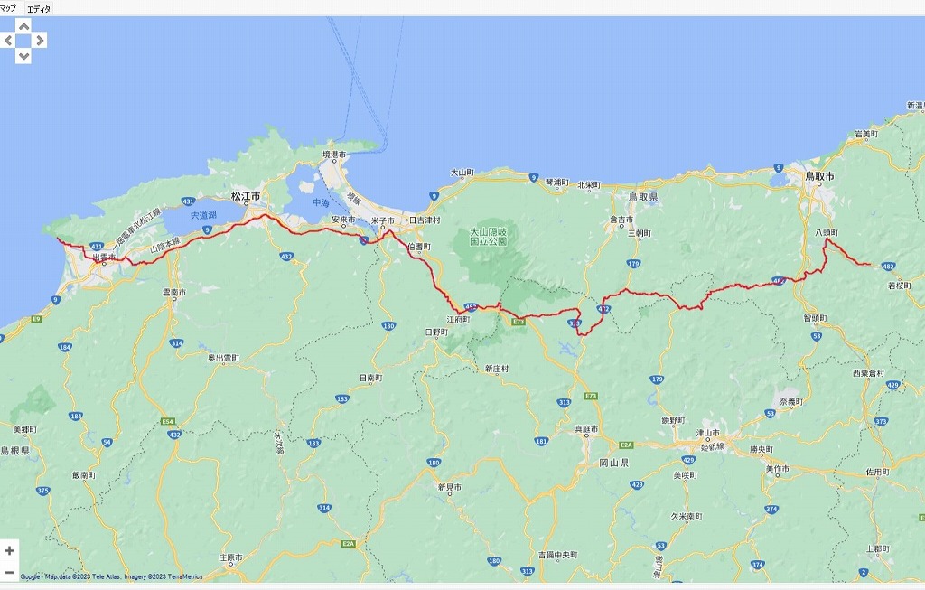 | 午前の道程:出雲市〜米子〜日野郡江府町〜兵庫県人形峠〜鳥取県八頭郡八頭町:212.19km | |