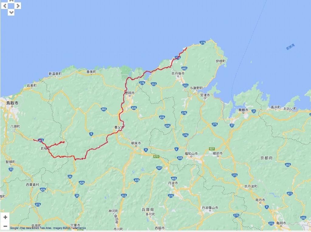 | 午後の道程:鳥取県八頭郡八頭町〜宍粟市〜養父市〜豊岡市〜京丹後 :154.25km |