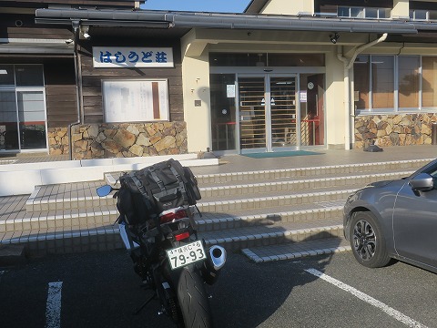 16:57 宿に到着 GW前ツーリングの記事が続きます。 今日は、朝島根県の出雲市を出発して山陰の山の中を東進して、京都府の京丹後までやってきました。 今夜の宿は、国道178号線からちょっと入ったところにある”はしうど荘”。 到着目標5時の3分前に到着です。 駐車場にバイクを停め、荷物を下ろして、チェックインします。 |