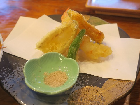 18:20 天ぷら まだ、出てきます。 揚げ物は今日は天ぷらでした。 熱々で出てきました。 写真を見ると、エビとキスとシシトウにカボチャだったみたいですね。 塩で美味しくいただきました。 |