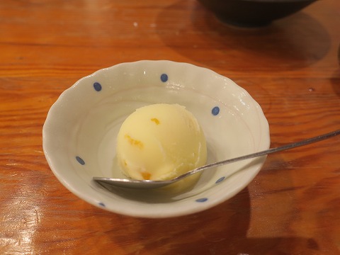19:08 デザートも と思ったら、最後にデザート。 柚子のシャーベット。 サッパリして、美味しい。 再度、「ご馳走様でした。」 |