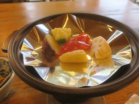 7:33 陶板焼きは 他に、野菜の陶板焼き。 レンコン、ヤングコーン、パプリカ、サツマイモ、に・・・・・、冬瓜かな。 個人的には肉っ気が少し欲しい。(笑) |