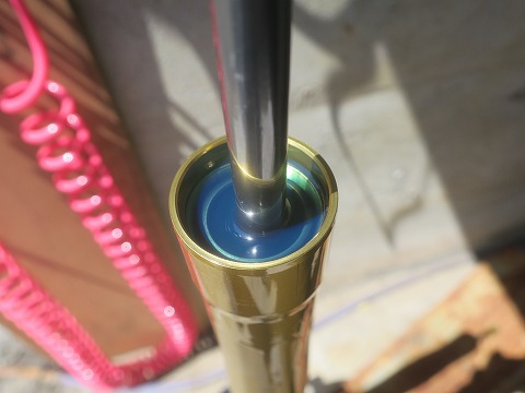 10:03 放置したフォークには フォークに注入したフォークオイルをのぞき込むと、表面に気泡が浮いてますね。 やっぱり一晩くらい放置してエアー抜きをした方が、エアーがきっちり抜けるみたいです。 |