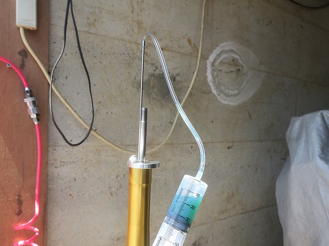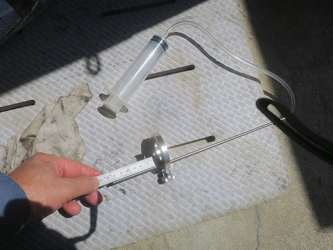 10:08 油面を調整 これで、ストッパーから下に75mm金属製のストローが挿入されていることになります。 で、注射器で吸い込んであげれば、油面は設定した75mmになる仕組み。 |
