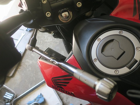 10:20 キャップ ボルトを締め付け キャップ ボルトを取り付けたら、規定トルクで締め付け。 本当は、下のナットはスパナで固定して締めるんですけど、手が2本しかないもんで、写真を撮るときだけスパナは省略。(笑) |