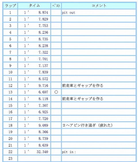 11:00〜11:25 B3クラス 11時になり、今日2本目の走行が始まりました。 1本目の走行で、今履いている在庫タイヤも問題ないようなので、最初から飛ばしていきます。 2〜3周して前走に追い着きますが、ちょうど良いペースな感じ。 距離をおいて、後ろを走ります。 でも、8秒台なのね。 (-_-;) 7周目に7秒台に復活。 前が詰まっちゃいました。 抜けるほどの速度差が無いので、12周目にペースダウンして、前走車とのギャップを作ります。 で、13周目にタイム アタックと言うほどじゃないけど頑張って走って、6秒台に入って6秒6。 14周目は、また前に詰まっちゃいましたね。 で、15周目には前走車がピットインして、前がクリアー。 ボチボチ疲れてきて左肩の後遺症で力が入り辛くなって、アジアコーナーの右から左への切り返しでワンテンポ遅れちゃう。 2ヘアピンまでのアクセルを開けるのも遅れちゃってるね。 18周目、アジアコーナーからの立ち上がり、アクセルを開けるのがワンテンポ遅れてるのを取り戻そうとして、ブレーキングが遅れて2ヘアピンを大回り。(笑) 次の周、もう一回頑張ろうと思って、最終の立ち上がりを速くしようと思ったら、立ち上がりで”ツッツー”ってリヤが流れた。 少しだけだけど、少しだけ。 逆ハン当てるほどじゃないけど。 速く走っている連中はこれくらいは当たり前なんだろうけど。 自分としては、タイヤも減ってるし、ちょっとビビる。(笑) やり過ぎたかなぁ〜。 と自重。 流石に疲れたっぽくて、後はチェッカー待ちで周回。 21周目にチェッカーが振られて2本目の走行、無事終了です。 |