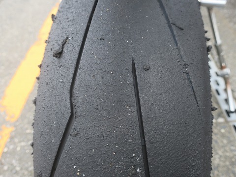 11:31 走行後の リヤタイヤ。 左は残ってるけど、右コーナーが多いので、右側はほぼ終了。 もう1本くらい走れそうですが、ここでタイヤ代ケチって転んだら、余計高いもんについちゃう。 (サーキット走っていると良く言うけどね) 交換した方がいいね。 走行後のエアー圧は、5kPaくらい上がる感じ。 今の時期なら、走り始めでもう少し下げてもイイかもしれないですけど、自分のタイムだと関係無いかな。(笑) |
