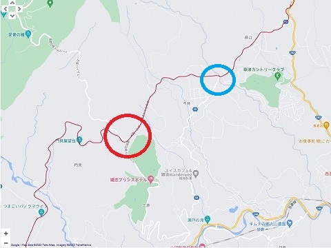 ルート間違い ルート間違いました。 (ーー;) 最初、パノラマラインを左下から右上に走りました。 赤丸のところは、パノラマラインと万座ハイウェーとの交差点ですが、パノラマラインが下段、万座ハイウェーが上段の立体交差のため、交互で行き来が出来ません。 その後パノラマラインで青丸のところまで進んで、県道59号線に突き当たったら 、左折じゃなくて、右折でした。 右折して、国道144号線付近まで南下、その後回り込むように走ると、万座ハイウェーの入口に到達できる様です。 自分は青丸の交差点を左折して、今は右上の県道59号線と国道292号線との交差点近くにあるセブンイレブンに駐まっています。 |