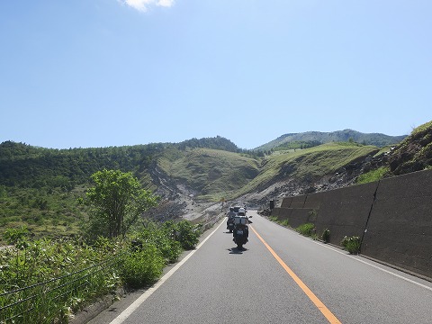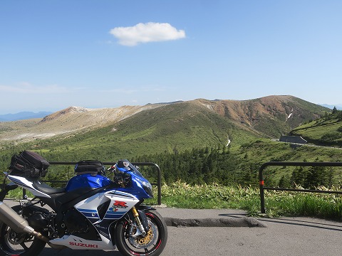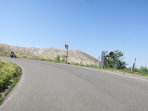 14:38 最高地点じゃなかった(笑) ”日本国道最高地点”の碑がある駐車場かと思って停まったら違った。(笑) 碑があるのは、もう一つ先の駐車スペースでしたね。 まあ、とりあえず走ってきた方向を振り返り写真を撮っておきます。 白根山周辺の荒涼とした風景が印象的です。 この後、最高地点の碑がある駐車場に駐まろうと思ったけど、クルマも人も一杯。 駐まるのやめました。 先に進みます。 |