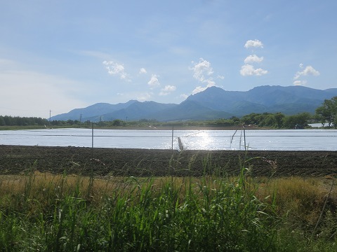 14:35 八ヶ岳を見ながら 八ヶ岳まきばラインは、その名の通り右手に八ヶ岳を眺めながら、農地の中を走ります。 標高を下げてきたので、暑くなってきました。 |