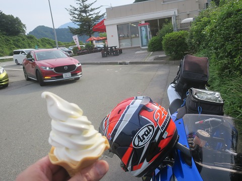 16:20 初狩 PAで 片側1車線の対面通行の区間はじっとガマンでやり過ごします。 その後韮崎からは、週末夕方で交通量は多いもののまあまあ順調に流れます さらに東進を続けると、大月JCTから渋滞情報あり。 その手前の初狩PAで待避。 体温下げるのにソフトクリームをいただきます。 |