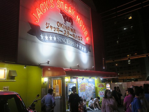19:32 初日の晩はステーキ さて、ホテルから歩いて10分程。 やってきたのは、”ジャッキー ステーキ ハウス”。 まだ移動の手段が徒歩しか無いんでね。 ホテルの近くにある飲食店をネットで探したら、ここが出てきました。 「やっぱり沖縄に来たら沖縄料理でしょう。」と思ったんですけど、昨日地元で飲み会があったので、お酒を飲むであろう沖縄料理は明日以降にすることにしました。 そして、沖縄では”〆にステーキを食べる・・・。”なんて情報もあったりして。 と言うことで、ステーキ。(笑) 店の前に到着すると、平日だと言うのに、まだ週の前半だと言うのに、この行列。 普段なら並びませんが、他のアイデアが浮かばなかったので、自分にしては珍しく待つことにしました。 |