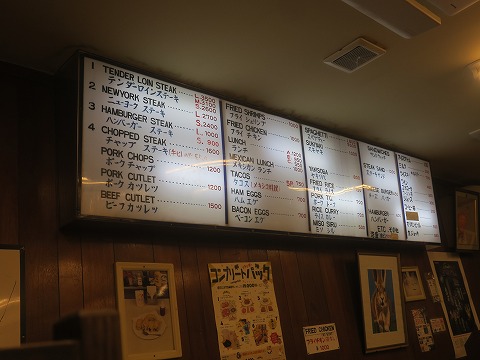 20:47 注文は と思いきや、席に案内するので店内に。と言うことで、早々に席に案内されました。 店内は4人~6人がけのテーブルが並んでいて、20テーブルくらいかな。 結構キャパはあって、回転も速いですが、来るお客さんの数も多いですからねぇ。 さっそく、注文しましょう。 メニューはテーブルにもありますが、壁にも。 注文は左上の代表メニューになる”テンダーロインステーキ”にしました。 テンダーロインは”ヒレ肉”のことね。 そして、サイズは”L”。 手元のメニューだと”L”は250gです。 もちろん、ビールを注文することは忘れない。(笑) |