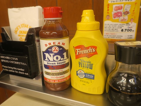 20:47 テーブルにあるのは テーブルにセットしてあるのは、ステーキ ソースとマスタード、それに醤油。 それに写真には写ってませんが、塩、コショウがあります。 その他には、”おろしニンニク・ガーリックパウダー・ウスターソース・ケチャップ・ハットソース”も言えば持ってきてくれるらしいです。 ハットソースって何、と思って調べたら、元は”ホットソース”で、タバスコみたいなものらしいです。 沖縄文化ですね。(笑) |